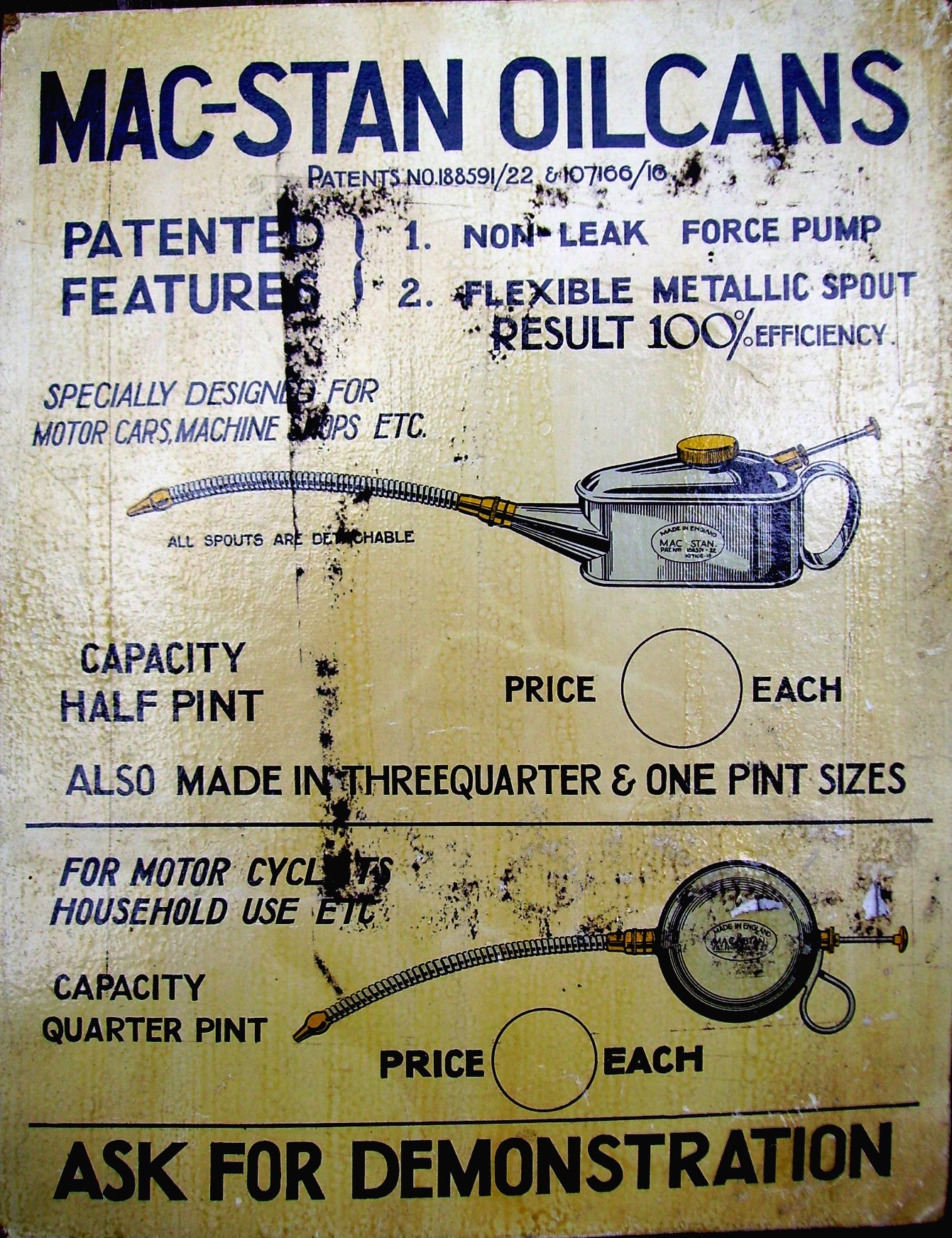 | Oil can history | According to current research items manufactured were not sold under the own name. They carried mostly the brand name of either the wholesaler or customer they have been contract manufactured for. Most prominent examples are the MAC-STAN stamped oil cans with flexible spout and references to two patents from the early 1920’s (see pictures and documents below). In addition to the above stamp some oil cans and other items produced carry a „Made in England“ logo as shown to the right. Although it is not 100% confirmed this stamp to be solely used by Walker & Loach I found at least one other (non-Mac-Stan) oil can that appears in their catalogue that carries solely this logo (see pictures below). | |