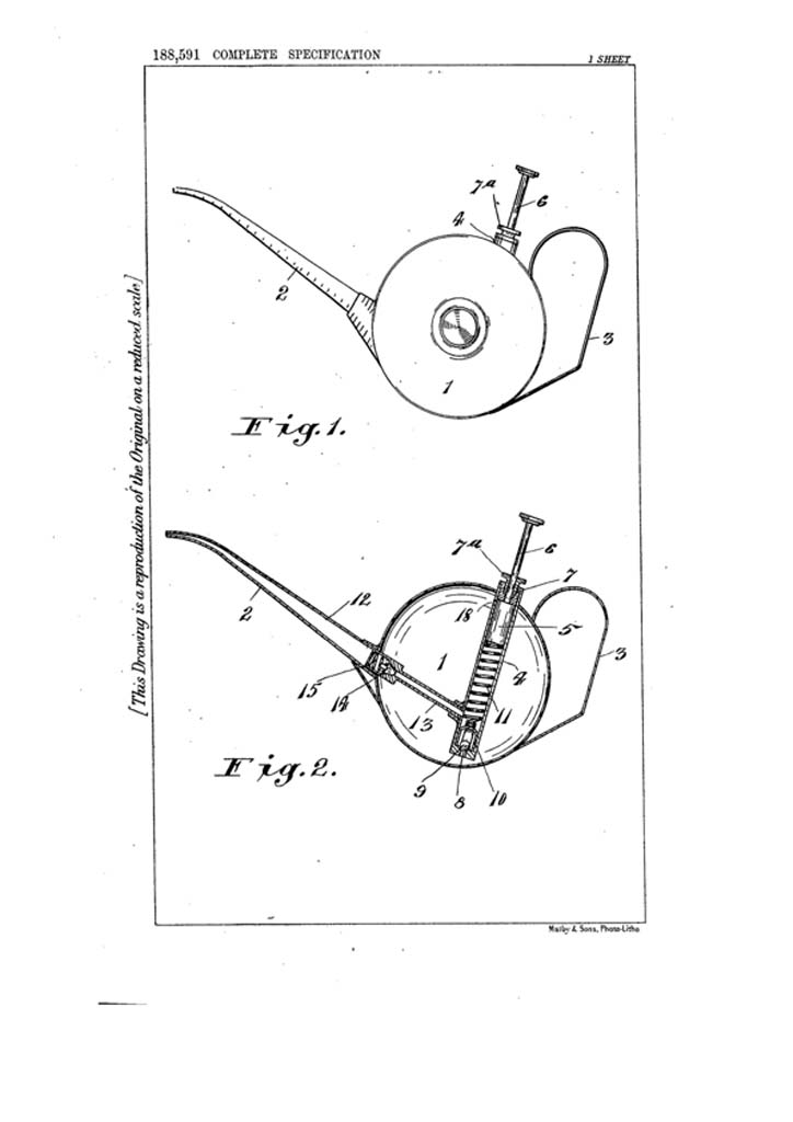| Oil can history | According to current research items manufactured were not sold under the own name. They carried mostly the brand name of either the wholesaler or customer they have been contract manufactured for. Most prominent examples are the MAC-STAN stamped oil cans with flexible spout and references to two patents from the early 1920’s (see pictures and documents below). In addition to the above stamp some oil cans and other items produced carry a „Made in England“ logo as shown to the right. Although it is not 100% confirmed this stamp to be solely used by Walker & Loach I found at least one other (non-Mac-Stan) oil can that appears in their catalogue that carries solely this logo (see pictures below). | |
